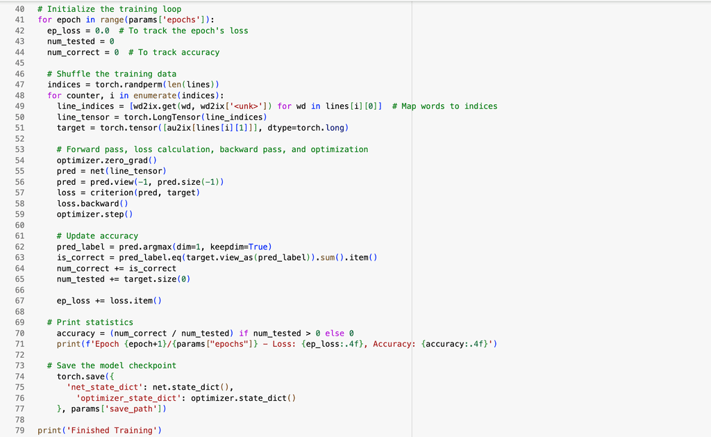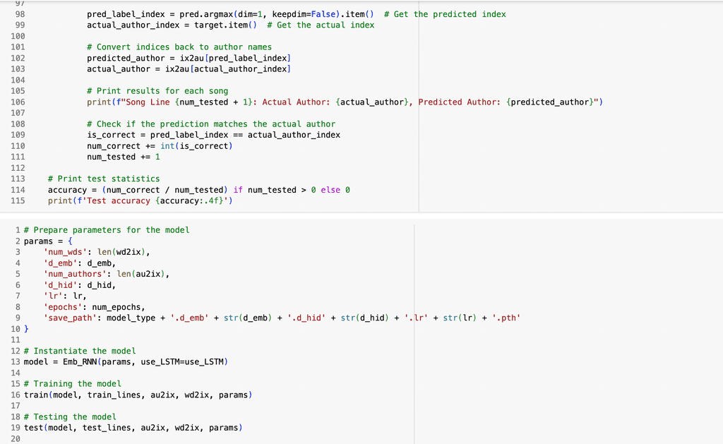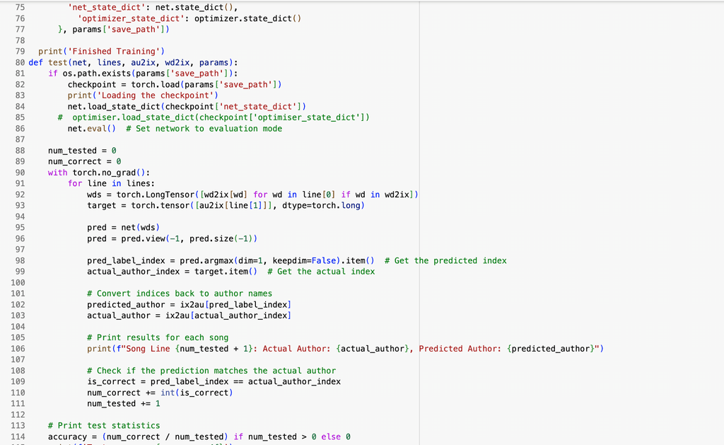 This code below trains and evaluates the neural network that predicts the author of a line of poetry or lyrics based on the words in the line. It begins by converting each unique word and each author in the dataset into numerical indices, which are essential for feeding text data into a neural network. The model parameters set LSTM to true. The training function starts by attempting to load any previously saved model checkpoints, allowing it to resume from where it left off rather than starting from scratch each time. It then processes each line in the training dataset by converting the words into their corresponding indices, running the sequence through the model to predict an author, comparing that prediction to the true author label, and adjusting the model’s parameters to reduce errors. This loop runs over one epoch (an epoch is a complete pass through the dataset), tracking both loss and accuracy to monitor learning progress. At the end of each epoch, the model is saved so that the best-performing version can be reused later. The testing function reloads the trained model and evaluates its performance on unseen examples. For each test line, it outputs both the predicted author and the correct author, and calculates the overall prediction accuracy. This setup allows the model to learn and distinguish stylistic patterns in writing, giving it the ability to attribute authorship based solely on stylistic characteristics found in text.