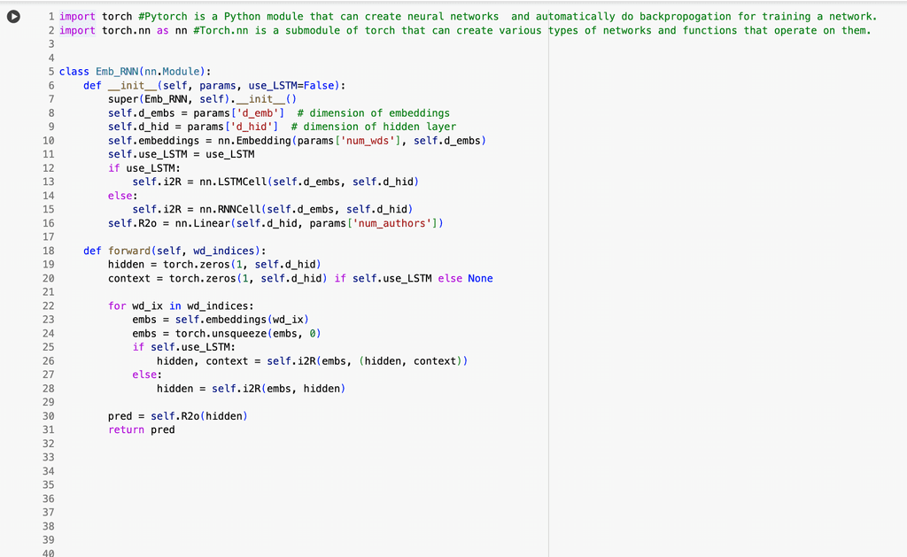 Below is the starter code provided by my professor. The first code block defines a simple neural network model using PyTorch that can predict the author of a line of poetry or song lyrics. It works by first converting each word in the line into a numerical format the model can understand, using what's called word embeddings. As the model reads the line word by word, it updates its internal memory using either a standard Recurrent Neural Network (RNN) or a more advanced Long Short-Term Memory (LSTM) system, depending on the setting. This memory helps the model keep track of context as it processes the line. Once it has read the entire line, it uses what it has learned to make a final prediction about which author most likely wrote it. The model was designed to be flexible and lightweight, making it a practical example of how natural language processing and machine learning can be used to analyze text patterns and infer authorship.