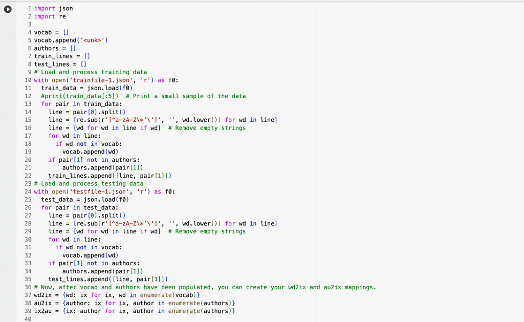 The second code block loads and prepares the training and testing data needed to train a machine learning model that predicts the author of a line of poetry or lyrics. It starts by importing two modules: one for handling JSON data and another for working with text patterns. It then creates lists to store the vocabulary (words the model will learn), author names, and the processed lines of text from both training and test datasets. The training and test files are read from JSON files, where each entry contains a line of text and its corresponding author. For each line, the code splits it into individual words, cleans them by removing punctuation or symbols, and converts them to lowercase. It adds any new words to the vocabulary and any new authors to the author list. Each cleaned line, along with its author, is saved for later use in training and evaluation. After processing all the data, the code creates dictionaries to map each word and each author to a unique number. These mappings are crucial because machine learning models work with numbers, not raw text. This preprocessing step sets the foundation for the model to understand and learn from the data.
