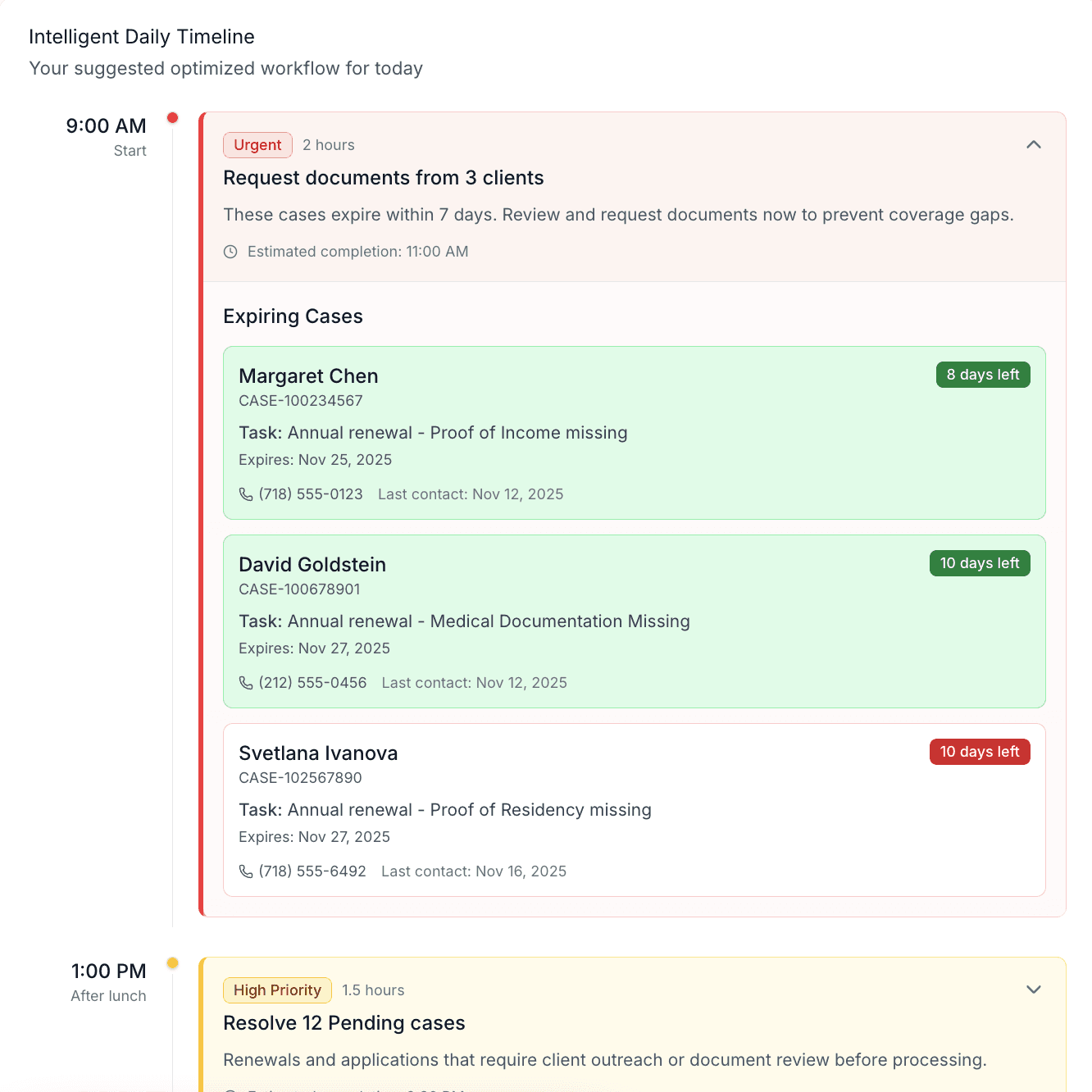Machine learning identifies these emerging issues and presents them in a list so caseworkers can intervene before delays lead to coverage gaps. The card also offers foresight into which cases are likely to appear next in the Optimized Timeline.
