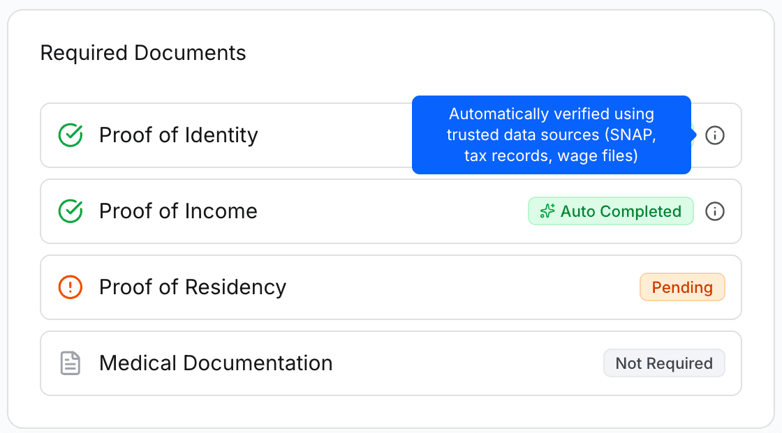 Medicaid agencies often have access to data from other government systems, but caseworkers typically need to search for that information manually. In CivicAssist, AI retrieves the required documents directly from these verified sources and automatically completes any steps it can. This reduces the burden on both clients and caseworkers by eliminating unnecessary requests and minimizing manual follow-up.