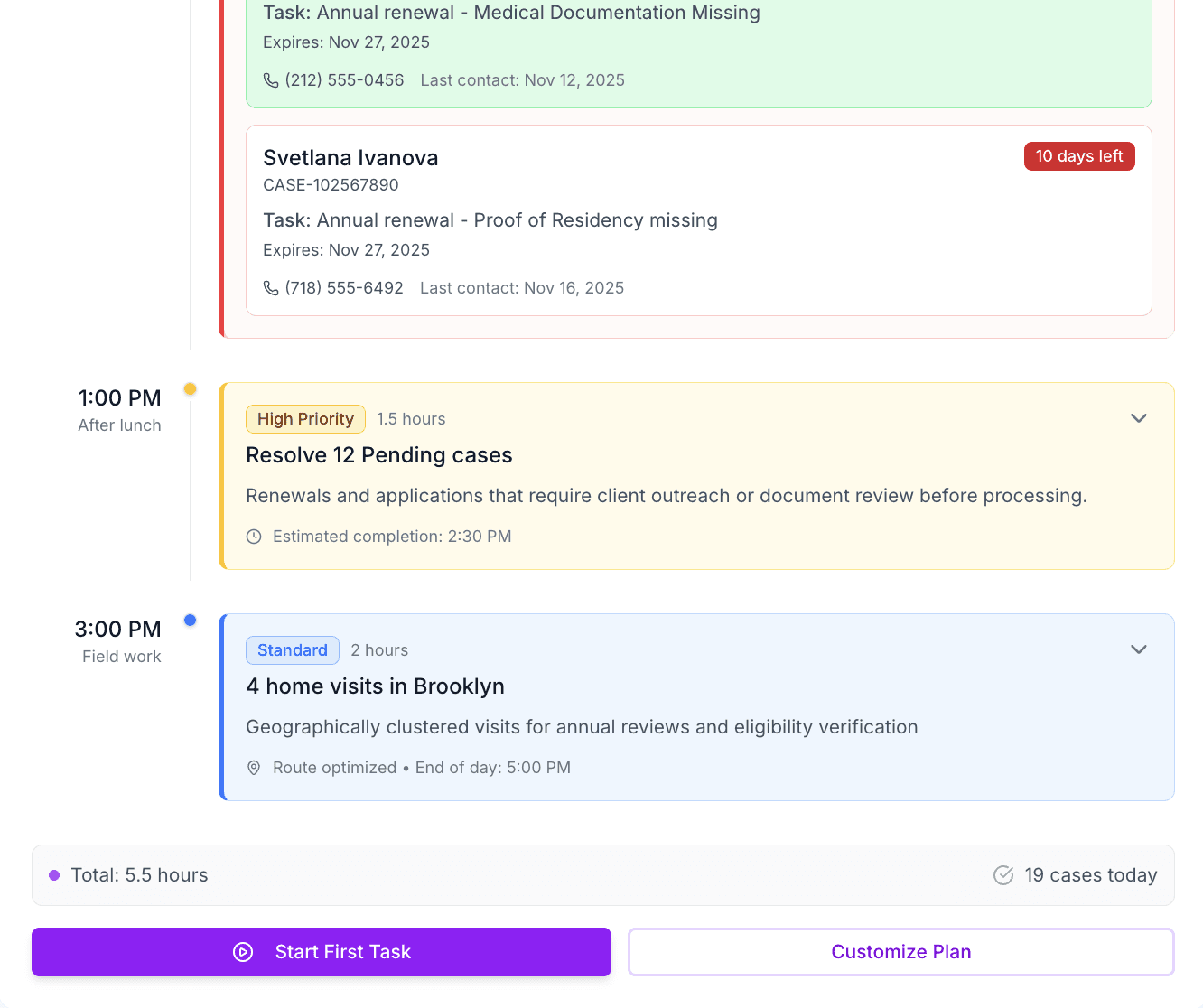 Caseworkers must process large volumes of time-sensitive Medicaid renewals using disconnected systems that require constant manual tracking and verification. These inefficiencies lead to preventable delays that can cause eligible clients to lose their coverage.