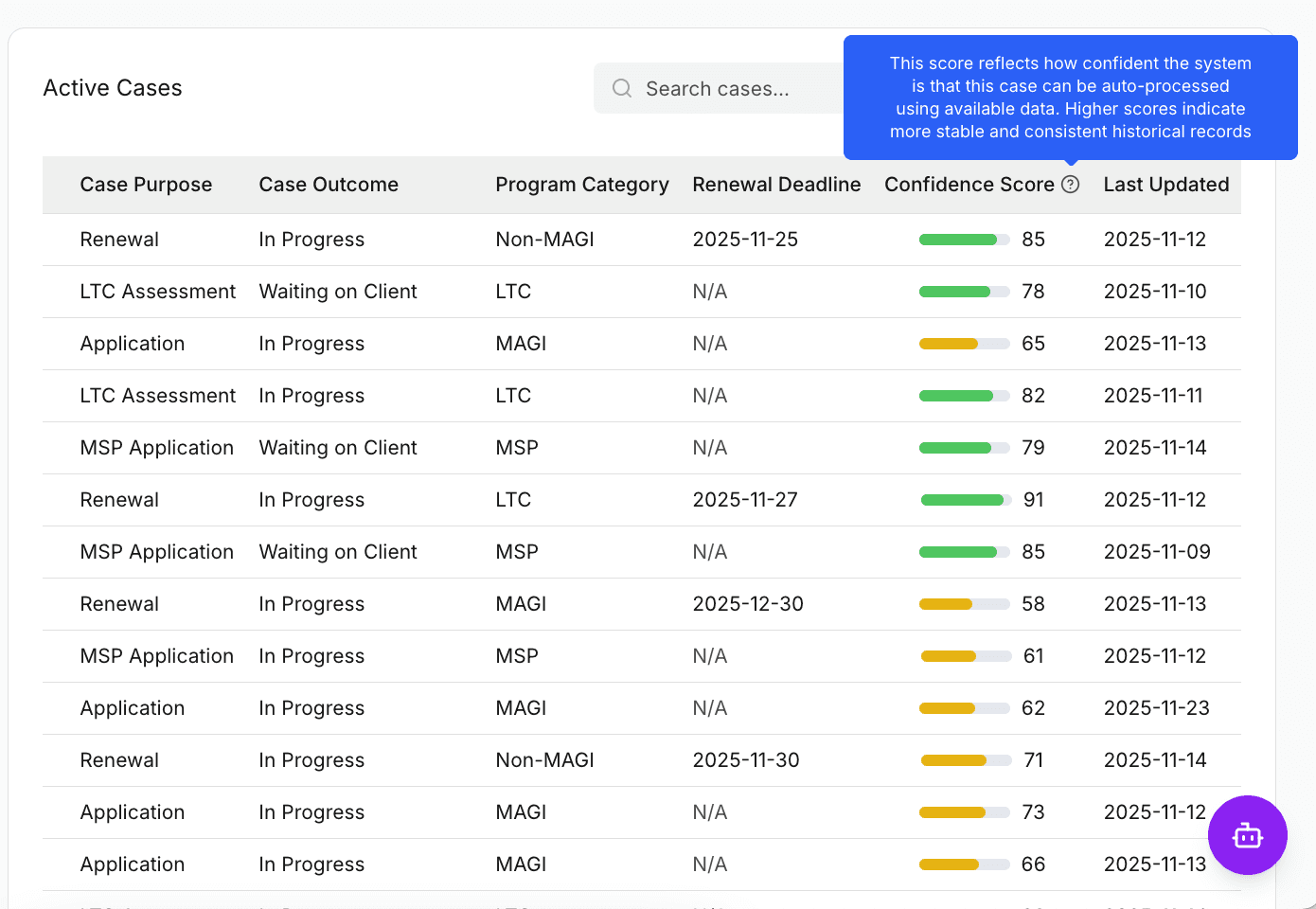 Every case is assigned a confidence score, which is an algorithmically generated numeric value that reflects how certain the system is that a renewal can be auto-processed using existing, trusted data. This score is especially valuable for renewal cases, which are a major source of preventable coverage loss. Many elderly, disabled, and low-income clients have stable eligibility yet still lose benefits due to paperwork barriers or missed communications.